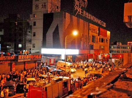 凌晨1時(shí),記者趕到事發(fā)現(xiàn)場,舞王俱樂部占地面積千余平方米,被一片民房包圍,外墻看不出明顯的火災(zāi)痕跡。廣告招牌依然亮著。記者進(jìn)入三樓俱樂部大廳看到,地面上散落著許多女式?jīng)鲂。俱樂部三四樓一片漆黑,玻璃窗全被打碎,窗口處被濃煙熏得一片漆黑,空氣中還凝聚著一股強(qiáng)烈的焦味。上完樓梯后有一條大約10米長的狹窄過道,在過道的地上全是逃生人員散落的鞋子。大廳中央是個(gè)表演舞臺,大廳里擺放著百余張桌子,周圍有十多間包廂。大廳里不少桌子、椅子被掀翻。