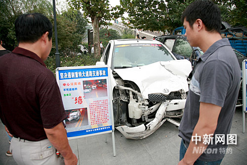 中新網(wǎng)杭州9月21日(見習(xí)記者袁爽 通訊員莊琪 張諄 馬進(jìn))9月21日上午,在杭州拱宸橋東側(cè)運(yùn)河文化廣場(chǎng),3輛已經(jīng)面目全非的機(jī)動(dòng)車被過往的市民圍得嚴(yán)嚴(yán)實(shí)實(shí),交通事故觸目驚心的圖片和活生生的“教材”產(chǎn)生了巨大的震撼力。 上午9 時(shí),“堅(jiān)決遏制重特大道路交通事故百日安全競(jìng)賽”在杭州運(yùn)河西廣場(chǎng)舉行宣傳啟動(dòng)儀式。