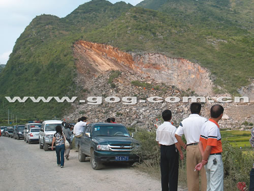 在山腳的左側,是普定縣臨時搭建的搶險救援臨時指揮部,相關部門的人員正在緊張工作,在通往事故現(xiàn)場的公路上,幾臺大型裝載機、挖掘機正向現(xiàn)場駛去。
