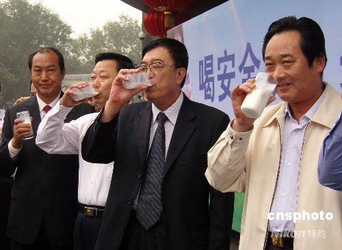 9月25日,石家莊市副市長張殿奎(右二)帶頭將滿滿一大杯某品牌純牛奶一飲而盡,隨行的石家莊市工商局、質(zhì)量技術(shù)監(jiān)督局、商務(wù)局等相關(guān)部門負責(zé)人也紛紛效仿,將手中品牌各異的滿杯純牛奶全部喝下,以消除此間民眾因三鹿問題奶粉事件而產(chǎn)生的顧慮。中新社發(fā) 牛琳 攝