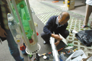 昨日,石才俊老人正在組裝他發(fā)明的空氣壓縮火箭。記者 陳浮 攝