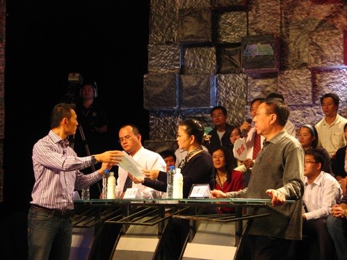 主持人:OK。你們這三個(gè)人的位置很特別,三點(diǎn)成一直線,你們簡(jiǎn)直是一個(gè)鼻孔出氣的。有反對(duì)的,反對(duì),好,這邊這位小姐請(qǐng)。掌聲歡迎她,請(qǐng),(掌聲)