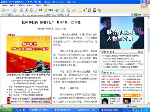 同時,在國內(nèi)多家網(wǎng)站社區(qū)和論壇內(nèi)也出現(xiàn)一則標題為《桂林全州10天驚現(xiàn)五具少女裸尸》的網(wǎng)絡貼子。一時間,這條消息在網(wǎng)絡瘋傳開來!
