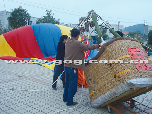 昨日上午,貴陽(yáng)和尚坡水電九局廣場(chǎng)里一片喜慶。記者在現(xiàn)場(chǎng)看到,由紅黃藍(lán)三色組成的熱氣球停在地面上,現(xiàn)場(chǎng)聚集了上百人圍觀。上午7點(diǎn),經(jīng)過(guò)嚴(yán)格培訓(xùn)后具備駕駛熱氣球技能的工作人員來(lái)到廣場(chǎng)上,他們分別對(duì)熱氣球進(jìn)行升空前的檢查工作:一組負(fù)責(zé)檢查熱氣球的整體情況;一組負(fù)責(zé)查看新郎、新娘乘坐的熱氣球竹籃;一組負(fù)責(zé)檢查、調(diào)試加熱設(shè)備。 7點(diǎn)40分,方江濤和劉小南乘坐婚禮花車抵達(dá)廣場(chǎng)。由于風(fēng)力較大,熱氣球必須將氣囊鼓足。就在這時(shí),鼓風(fēng)機(jī)很不識(shí)趣的“罷工”了,不論工作人員怎么努力調(diào)試,鼓風(fēng)機(jī)還是一動(dòng)不動(dòng)。看到這樣的情形,方江濤只好從花車上跳下來(lái),挽起衣袖檢查機(jī)器。20分鐘過(guò)去了,鼓風(fēng)機(jī)終于“砰砰砰”發(fā)出聲響。在一旁圍觀的群眾打趣說(shuō)道:“看來(lái)這個(gè)即將升空的‘神舟八號(hào)’只有新郎才能搞定呀!”