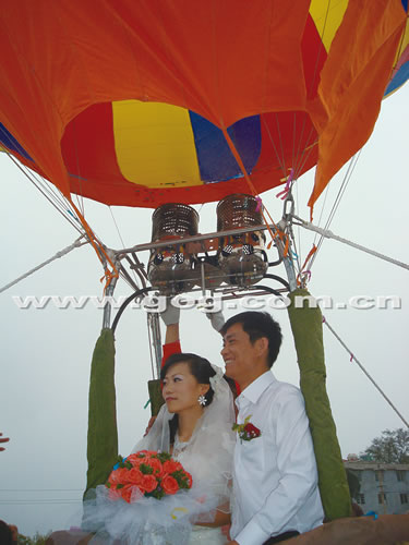 8點(diǎn)20分,新郎方江濤和新娘劉小南坐進(jìn)1米高的竹籃里,乘坐被4根繩子拽著的色彩鮮艷的熱氣球慢慢升空了。1米、2米……熱氣球在掌聲中一點(diǎn)點(diǎn)離開地面,新人的臉上也充滿了喜悅和興奮,新娘向地面不住地舞動(dòng)著手臂,新郎也不時(shí)地替新娘整理被風(fēng)吹起的秀發(fā)。大約10分鐘,熱氣球升高到50米左右后,漸漸下落回到地面。