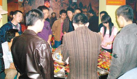 位于西安高新區(qū)光華路徐家莊村北口的一家“電玩世界”以電玩娛樂(lè)游戲?yàn)槊,套間內(nèi)卻擺了6臺(tái)大型“動(dòng)物樂(lè)園”游戲賭博機(jī)聚眾賭博。記者昨夜暗訪,發(fā)現(xiàn)6臺(tái)賭機(jī)前圍聚了上百名男女?dāng)S金歡賭,其中一名男子的大把鈔票被“吞”入賭機(jī),僅1小時(shí)便賭掉了萬(wàn)余元。記者現(xiàn)場(chǎng)報(bào)警,害人賭窩當(dāng)晚被端。
