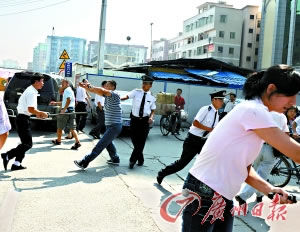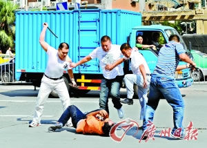 廣州日報10月18日報道 昨天上午10時,廣州市中山大道,四個壯漢當街毆打一名《廣州青年報》的送報員,兩名白色衣服的保安自始至終在一邊旁觀。后來,有市民上前勸說阻擋,并協(xié)助警察將其中兩名犯罪嫌疑人抓獲。