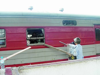 昨日清晨6時57分,由廣州開往長沙的5362次列車到達長沙車站,?吭谌九_五道。長沙車站派出所民警戴戈與列車乘警辦理完交接手續(xù)后,接到該車行李員陽小華報告,稱當日6時許,該次列車到達株洲裝卸完行李準備開車時,突然沖上來一名穿白T恤的中年男子,“撲通”一聲跪倒在他面前,稱有人追殺他。同時,該男子手持深圳至婁底的車票。男子上車后一直躲在行李后,充滿恐懼,經行李員多方勸解無果。列車終到長沙車站后,該男子將行李員趕下車廂,將行李車廂的正門反鎖,將通道門用貨物堆碼封閉,并手持一根釘有鐵釘、長1.5米的粗木棒揮舞,不許任何人靠近。