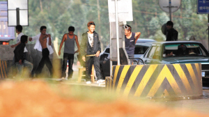 16日下午2點(diǎn),記者來到丫普龍收費(fèi)站。通過的車輛很少,6個(gè)收費(fèi)道口只開放4個(gè)。紅白相間的收費(fèi)亭里,坐著幾名身著工作服的收費(fèi)員。每個(gè)收費(fèi)匝道口都橫著一根涂有反光涂料的欄桿,幾個(gè)身著各式T恤、襯衫的年輕小伙坐在匝道旁。他們身旁擺放著幾根木棍,大約1米長,其中一人的坐椅下還擺放著一根鋼管。