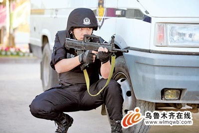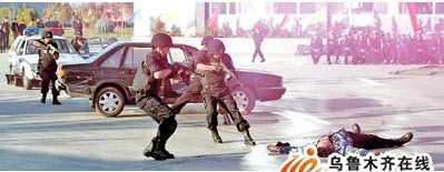 高速公路上,一輛黑色轎車突然沖過交警卡點,警笛響起,頭戴鋼盔、手持微型沖鋒槍的特勤民警快速出擊,嫌疑人向民警開槍時被“擊斃”……10月21日,新疆高等級公路交警支隊進行了建隊十年來,規(guī)模最大的一次快速應對高速路突發(fā)事件演習。