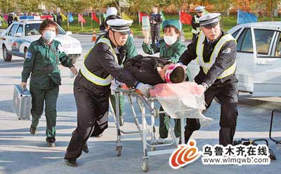 交警和120急救人員展開現(xiàn)場急救運送“傷者”。