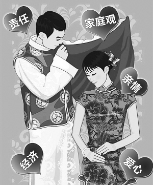“結(jié)婚生子、白頭偕老的婚姻觀依然占主導(dǎo)地位!毙彀茬髡f,65.6%的人贊同“不管怎么說,人總是要結(jié)婚的”,反對(duì)的為15.2%;72%的受訪者贊成“婚姻是神圣的,結(jié)了婚就要白頭到老”,不贊同的僅為6.7%。此外,84.4%的人反對(duì)“結(jié)婚后不要孩子”,對(duì)“丁克”家庭持肯定態(tài)度的僅占1.6%。