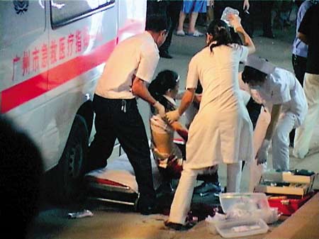 今日凌晨1時許,記者趕到新市蕭崗涌北大街43號一小食店門前,看見一名穿著白色上衣的女子躺在地上,身旁是一把沾滿鮮血的菜刀。該女子左耳朵連同臉上的肌肉被劈了下來,只有一絲皮肉連著。左手臂骨頭被砍斷,致命的一刀砍在腰部,腰椎被砍斷,腸子從傷口處流了出來。醫(yī)務(wù)人員對其進(jìn)行包扎搶救后,抬進(jìn)救護(hù)車送往醫(yī)院搶救(見左圖)。