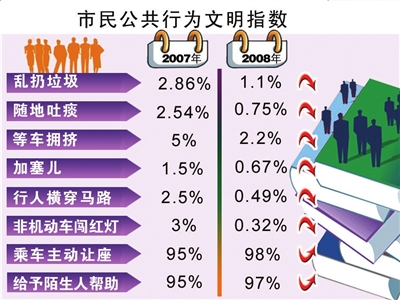 調(diào)查顯示,2008年北京奧運(yùn)會(huì)期間,北京市“市民公共行為文明指數(shù)”為82.68,比去年提高了9.3個(gè)分值。