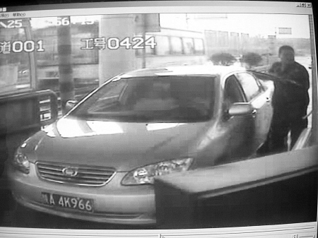 14時(shí)57分,該男子拿出一個(gè)證件模樣的東西給收費(fèi)人員亮了亮,然后進(jìn)入車內(nèi)。