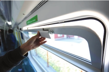 4號線列車內(nèi)部最特別的地方是車窗。普通列車車窗是全封閉的,但4號線列車每個車窗的上弦窗都可開啟。乘客只需抬起上弦窗部開關(guān),上弦窗便可自外而內(nèi)向上開啟30度。這樣既滿足了乘客對車內(nèi)通風的緊急需求,也保證車窗打開后列車安全運行。