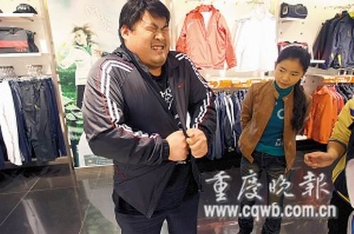 普通衣服不行,寬大的運(yùn)動(dòng)服或許可以!在記者建議下,王杰來(lái)到南坪步行街的某運(yùn)動(dòng)專(zhuān)賣(mài)店,店長(zhǎng)拿出該店最大的4XL特大裝,王杰連袖管都不能自主穿進(jìn)去,后在眾人協(xié)助下勉強(qiáng)穿上身,卻像成年人穿童裝,明顯不合身。