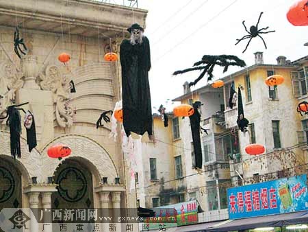 11月1日是西方傳統(tǒng)的“鬼節(jié)”——萬圣節(jié)。10月30日,為迎接萬圣節(jié),南寧市古城路某娛樂城在門口懸掛了一些青面獠牙的假人。娛樂城這一特殊的“廣告”引來了爭(zhēng)議。