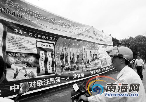 叫賣對(duì)聯(lián)版權(quán)的人叫梁其恒,?谑协偵絽^(qū)甲子鎮(zhèn)人。梁其恒告訴記者:“近幾年,農(nóng)村的變化很大,農(nóng)民的生活水平也有了很大提高。自從瓊山合并到?诤,?谑形姓畬(duì)農(nóng)民的生活很重視,相繼解決了農(nóng)民喝水難、行路難等問題。農(nóng)村合作醫(yī)療以及減免義務(wù)教育階段學(xué)生學(xué)雜費(fèi)、課本費(fèi)等政策,使農(nóng)民看病更容易了,醫(yī)藥費(fèi)也更便宜了,孩子們都上得起學(xué)了?吹竭@一切,梁其恒對(duì)黨和政府充滿了感激之情,開始尋思著利用一種形式把這種感激之情表達(dá)出來(lái)。最后,他選擇了創(chuàng)作對(duì)聯(lián)。據(jù)梁其恒介紹,他從2003年3月開始構(gòu)思,前后花了兩年多時(shí)間,不斷修改創(chuàng)新,終于于2005年12月份完成了對(duì)聯(lián)《和諧人間》的創(chuàng)作(上聯(lián):錦繡中華與時(shí)俱進(jìn);下聯(lián):濤瀛神州繼往開來(lái);橫聯(lián):和諧人間)。《和諧人間》創(chuàng)作完成后,梁其恒邀請(qǐng)了海南知名的書法家書寫文字,并自費(fèi)印刷了幾百份,在親戚朋友間發(fā)放。梁其恒說(shuō),親戚和朋友們對(duì)他的對(duì)聯(lián)都很喜歡,還有許多臨高、瓊海等地的外地人也慕名而來(lái),甚至還有人自愿掏錢購(gòu)買他的對(duì)聯(lián)。