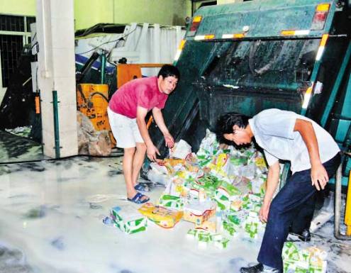 高先生說,國家規(guī)定對9月14日前出場的不合格乳制品進(jìn)行銷毀處理,但并沒有規(guī)定具體銷毀方法。他們選擇將液態(tài)奶送垃圾站處理,是因?yàn)樗麄冋J(rèn)為這是一種比較正規(guī)的銷毀方式。而在小城市,一般只是將成箱液態(tài)奶集中后碾壓,然后掩埋。