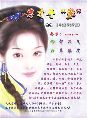 昨日,記者在楊家坪楊馨酒店外的廣告宣傳欄上看到這則由A4紙打印的征婚廣告,上面還有一張古典裝扮的美女圖。廣告上寫到:“本秀才五官端正,四肢健全,真誠,善良,正直,有理想……目前有形資產(chǎn)6位數(shù),無形資產(chǎn)9位數(shù),未來的億萬富翁,慈善家……尋找芳齡20~30歲,電視連續(xù)劇《上海灘》里馮程程類型的未婚千金小姐101名共創(chuàng)未來!(1名共創(chuàng)家庭,100名共創(chuàng)事業(yè))”廣告上,除了一個(gè)QQ號碼外,沒有留下其他任何聯(lián)系方式。