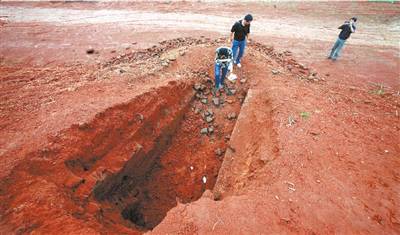 從山坡上可以看到出土漢代耳珰的平臺(tái)已經(jīng)被挖空了一大塊。據(jù)唐濤介紹:“6月初他們剛剛開工不久,我們(郴州市文物管理處)6月4日就在這塊被挖空的平臺(tái)發(fā)現(xiàn)了一座漢代磚室墓,當(dāng)時(shí)下達(dá)了‘停工通知書’,告知建設(shè)方,需經(jīng)我們對(duì)墓葬發(fā)掘后才能再動(dòng)工!钡且患埼臅缡链蠛#恢菔形奈锕芾硖帥]有接到建設(shè)方的任何回復(fù)。