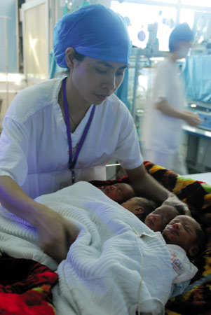 盡管孩子的父親失蹤,孩子們在醫(yī)院得到很好的照顧。記者采訪時看到四胞胎躺在嬰兒溫箱里睡得很香。醫(yī)務(wù)人員告訴記者,四胞胎屬于早產(chǎn)兒,住院前四胞胎中的男嬰肺部出了點問題,吸過幾天氧,現(xiàn)在情況已基本穩(wěn)定,另外三名女嬰的健康狀況都比較好。