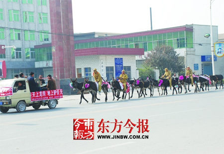 河南衛(wèi)輝市一驢肉店雇人穿日本軍裝騎驢游街促銷,不僅服裝、道具被收繳,近日還被工商部門罰款1萬元。