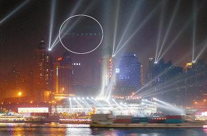 昨日中午,記者從小王提供的拍攝于前晚7點(diǎn)17分的照片上看到,朝天門的“朝天揚(yáng)帆”燈飾已經(jīng)打開,顏色不一的激光燈從周圍的建筑物頂上射出耀眼的彩光。而在朝天門大酒店的左上方,就能清晰地看到一串“飛碟”正斜斜地“飛”過。