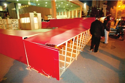 這個(gè)展板是國(guó)展內(nèi)一個(gè)已經(jīng)閉幕的珠寶展的宣傳板。記者看到,這個(gè)展板寬約7米、高3米多,由木條和木板拼成,展板的底部纏著兩根直徑不足1毫米的鐵絲。一名保安說(shuō),鐵絲是固定展板的!斑@么細(xì)的鐵絲,不倒才怪呢!彼f(shuō)。