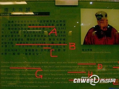 在介紹到隋朝歷史時(shí),展板上的文字說(shuō)明寫(xiě)到:“Daxing City of the Sui Dynasty”(公元581-681)……”,且不論翻譯是否正確,這隋朝的滅亡時(shí)間怎么就從公元618年推遲到公元681年了?生生是讓隋朝遲亡了63年,而這時(shí),唐太宗李世民(公元598~649)都已經(jīng)死了。在另一處說(shuō)明中這樣寫(xiě)道:“天顯元年(公元742年)……”,其一,“天顯”年號(hào)跟隋唐根本沒(méi)有任何關(guān)系,而應(yīng)該是遼太祖耶律阿保機(jī)的年號(hào);其二,742年應(yīng)該是“天寶元年”。
