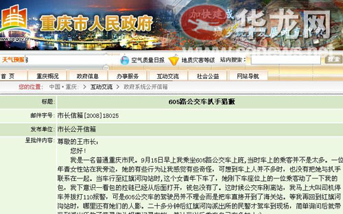 在605公交車上遭偷,求助司機(jī)又受冷遇,只好眼睜睜看著賊娃子脫身,重慶市民熊先生就遭遇了這樣無奈又憤怒的事情。氣憤之余,熊先生提筆向市長求助。今日,記者在重慶市政府信息網(wǎng)市長信箱上看到,該信箱公布了熊先生的訴求,有關(guān)部門也已著手解決了熊先生反映的尷尬之事。