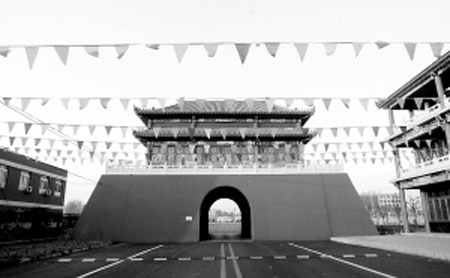 昨天,在位于通州區(qū)土橋新橋東側大約500米處皇木廠村村口,記者看到了這座仿古的城門樓——整座門樓至少30米高,樓身為紅色,只有一個門洞。
