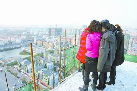 昨日下午3時,記者趕到航海路與未來路交叉口附近的中鼎翡翠2期公園壹號樓盤。記者上到25層樓頂,看到6名女子正站在西側沒有任何防護設施的邊緣。聞訊趕到的管城消防大隊一中隊消防員和航海路派出所民警已經(jīng)趕到現(xiàn)場,對欲跳樓的6名女子進行勸說。由于風大很冷,記者注意到這些售樓小姐相互之間聚得很緊。