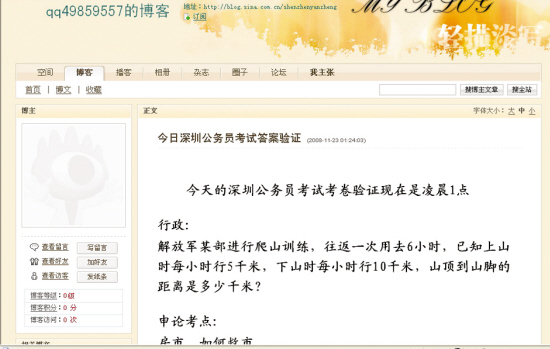 深圳公務(wù)員筆試在本月23日進(jìn)行,24日一早就有考生對(duì)記者反映:今年深圳公務(wù)員考試題泄露了,他已經(jīng)在網(wǎng)絡(luò)上見(jiàn)到了標(biāo)題為“今日深圳公務(wù)員考試答案驗(yàn)證”的博客日志,顯示的發(fā)帖時(shí)間是23日的凌晨1時(shí)24分。該帖發(fā)布試題行政部分與“申論:房市、如何救市”的試題與他參加考試的試題完全一樣。