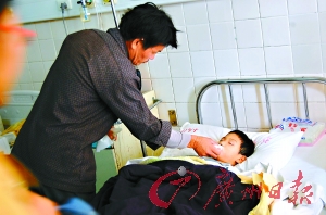 昨天中午12時30分,在汕頭市中心醫(yī)院住院B樓兒科病房17號床前,站著一個中年男子,他叫高貴增。高貴增身穿一件較舊的深色麻布衣服,腳踩一雙磨損的藍色人字拖鞋,亂蓬蓬的頭發(fā)下是一張擠滿皺紋的黑瘦臉龐。他表情木訥地站在不大的病房里,看著病床上躺著的9歲兒子小海(化名),孩子鼻孔里塞著氧氣管,在病床上已經(jīng)躺了6天。
