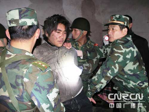 20時20分,案犯又要求其母送打火機(jī)吸煙。20時22分,在聯(lián)指授意下,其母讓案犯開了燈,并告之家里沒有任何人,案犯放松警覺,準(zhǔn)備開門出來。盧參謀長示意突擊組做好突擊準(zhǔn)備,在案犯開門一剎那,孫參謀一手用強(qiáng)光疝氣燈照住案犯雙眼,趁案犯尚未反應(yīng)過來,一手持應(yīng)急棍將案犯打倒在地,參戰(zhàn)官兵迅速將其生擒并帶離現(xiàn)場。