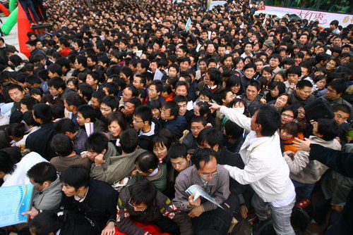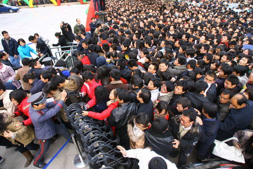 為防止意外發(fā)生,工作人員爬上門口的桌子,拿著擴音喇叭一遍遍地提醒應(yīng)聘者不要再擁擠。省人才交流中心緊急組織20多名工作人員及保安趕到北門口處維持秩序。不少女生實在擠不到跟前,只好往后撤退,稱“明天人少了再來”。