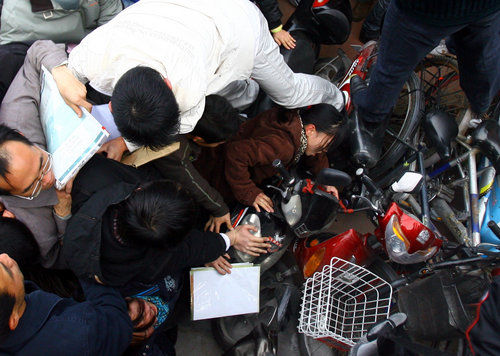 上午10時左右,因進場的學(xué)生太多,盡管開放了兩層招聘會場,省人才交流中心仍不得不暫時關(guān)閉大門,限制應(yīng)聘者入場。此時,擠在北門口處的人潮,開始騷動。擁擠中,自動伸縮門被擠掉一半,門口處幾輛電動車的外殼被擠爛。