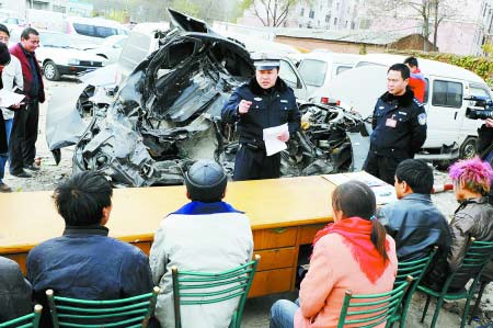 在事故停車(chē)場(chǎng)內(nèi),民警鄭敏軍將7人帶到了一輛已成廢鐵的事故轎車(chē)旁,告訴他們:11月21日,在鄭密路上,一輛東風(fēng)大貨車(chē)在違法超車(chē)時(shí),從右前側(cè)撞上這輛比亞迪F3轎車(chē),轎車(chē)被撕裂為兩半,轎車(chē)司機(jī)當(dāng)場(chǎng)死亡。而貨車(chē)司機(jī)也為自己的行為付出了慘痛的代價(jià)!昂芏嗍鹿识际怯晌覀冞`法駕駛導(dǎo)致的,眼前就是一個(gè)很慘痛的教訓(xùn)。”鄭敏軍說(shuō)。