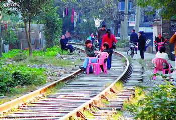 隨后,記者又從開福寺路沿鐵路往南走,沒多遠就看到10多位居民坐在鐵路上休息聊天,有的將椅子放置于鐵路的中央,有的則抱著孩子坐在枕木上,這些人若無其事地談笑著,根本沒有考慮到安全問題。