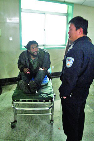 下午4點,濟南市中心醫(yī)院急診大廳,一名滿臉胡子、衣著破舊的男子坐在擔架上!拔沂莵砜床〉,放開我”,雙腳還被繃帶束縛著的他搖頭晃腦,“我喝酒了,我做錯了,我給你們磕頭”。