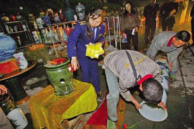 昨日,江北區(qū)洋河北路,執(zhí)法人員對(duì)40多件瓷器實(shí)施暫扣 記者 劉嵩 攝
