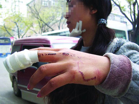 小李講述自己的遭遇時(shí),顯得既激動(dòng)又害怕,偶爾流下眼淚。她的下巴和左手中指都包扎著,左手背和袖口上還殘留著不少血漬。她還挽起褲管,小腿上可見(jiàn)片片淤青。