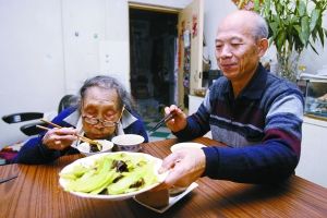“別急,還有菜”,宋金萍沖老師耳朵提高聲調(diào),并端起菜碗往老師碗里添菜。