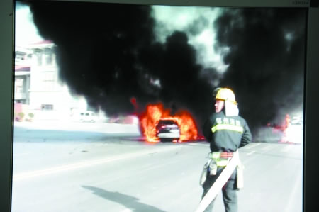 由于擔(dān)心車內(nèi)還有人被困,侯隊長立刻派3名隊員和一輛高噴車從不同角度滅火。5分鐘后火勢基本上被控制,消防隊員查看后發(fā)現(xiàn)車內(nèi)并無被困人員。“心總算放回肚子里去了!焙铌犻L說,七八分鐘后大火就被全部撲滅。