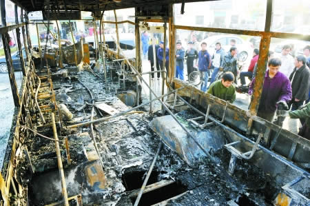 下午3時許,出事的白色奇瑞已被拖離現(xiàn)場,被燒壞的公交車趴在地上,外胎已被燒化粘在地上,車內(nèi)的坐椅、玻璃也在大火中全部燒化,整個車體只剩下一個框架。“乖乖,鋼板都燒化了!币幻麌^者舉著兒子使勁往前湊。