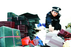 民警打開房門發(fā)現(xiàn),里邊的假證件堆積如山,連開門都費勁。假證乍一看與真證書相似,可細看就會發(fā)現(xiàn)制作粗糙。公安機關正在追查這些假證件的來源。(記者林靖 通訊員薄士德 楊陽攝)