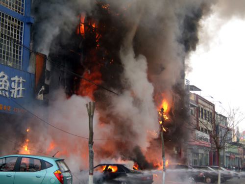 下午四點,記者從中銀大道鑫源福瑞特超市出來,發(fā)現(xiàn)北方有大量煙霧,順煙霧而去,在建設路口與消防車相遇,共同趕往事發(fā)地點。中銀大道已經(jīng)圍滿了人群,著火的商店火勢猛烈,被燒碎的玻璃啪啪直往下掉,門前的汽車也著了,一輛為晉M89550的紅旗轎車已經(jīng)燒的面目全非了。