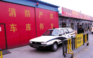 停靠在朝陽(yáng)東郊市場(chǎng)內(nèi)消防車(chē)庫(kù)門(mén)前的“山寨警車(chē)”。晨報(bào)記者 蔡代征/攝